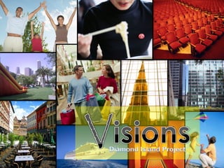 The document outlines a proposal by Venus Communications for promoting the Diamond Island project, emphasizing a vision-driven approach to attract world-class investments. It details a multi-faceted communication strategy that leverages innovative technologies and creative materials to present investment opportunities effectively. Key elements include a visually engaging booth design, advanced advertising methods such as holographic ads and lenticular packaging, and a personalized website to enhance the investor experience.