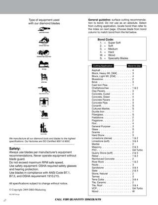 The document provides a product catalog for diamond cutting blades and tools from National Diamond, emphasizing their expertise in the industry since 1988. It includes specific recommendations for bond selection based on materials and applications, along with safety guidelines for usage. Various blade specifications, including unique features and performance characteristics, are detailed to assist in selecting suitable tools for different cutting tasks.