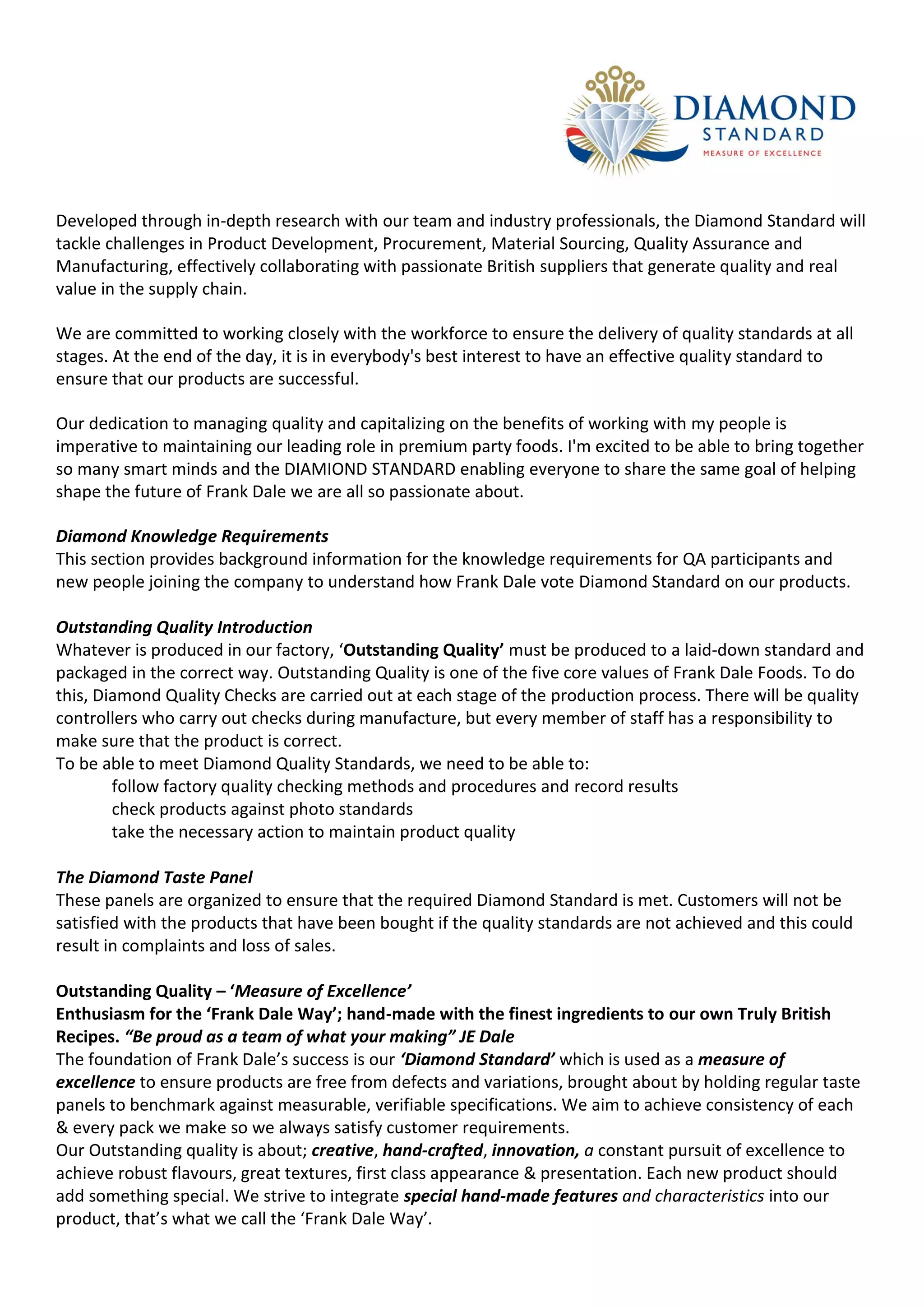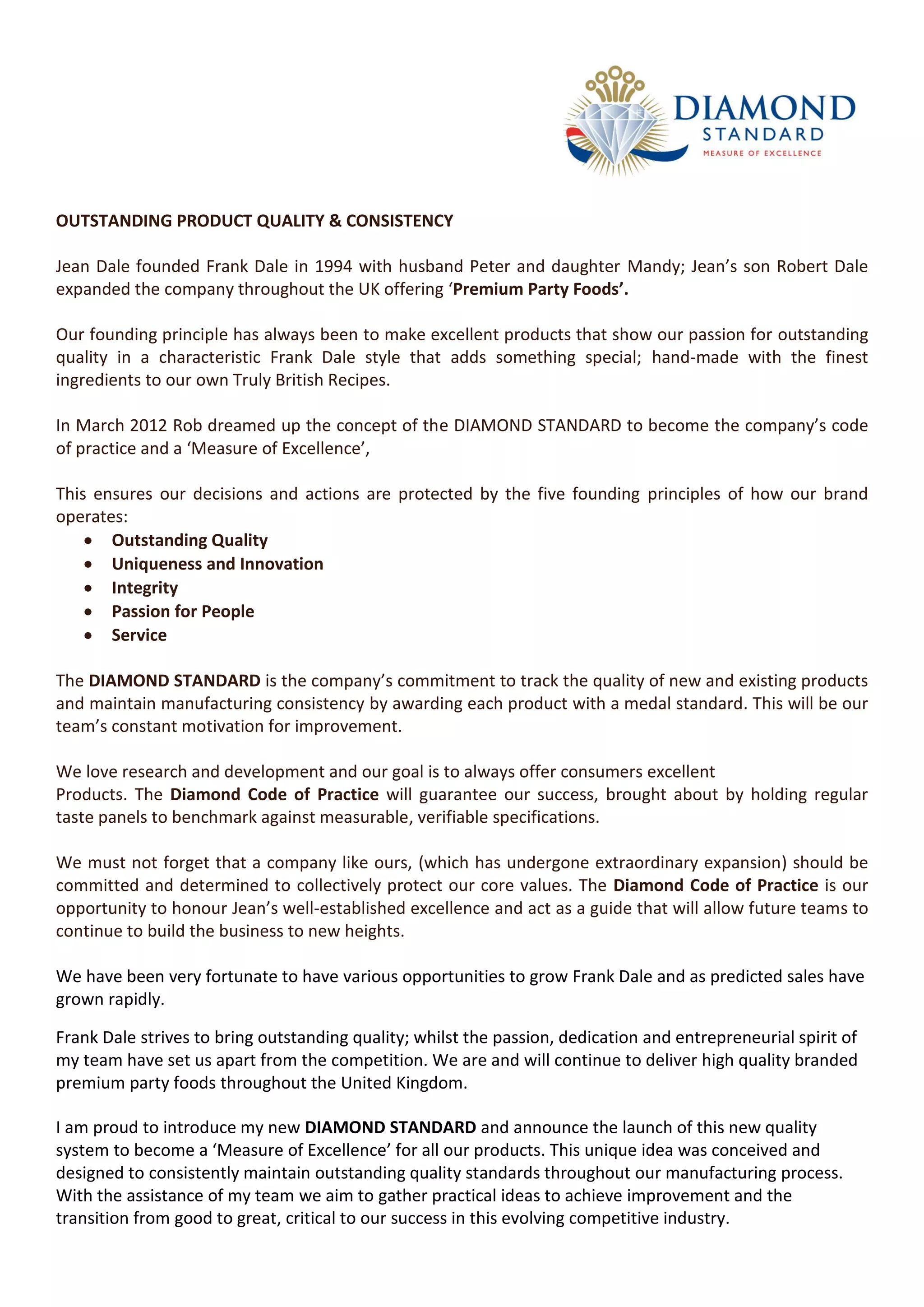 Frank Dale was founded in 1994 and has since expanded throughout the UK offering premium party foods. In 2012, the company introduced the Diamond Standard, a code of practice and measure of excellence focused on outstanding quality, uniqueness, integrity, passion for people, and service. The Diamond Standard ensures products meet measurable quality standards through regular taste panels and guarantees the company's success in the competitive food industry. Frank Dale is committed to the Diamond Standard and working closely with suppliers and employees to deliver quality products at every stage of production.