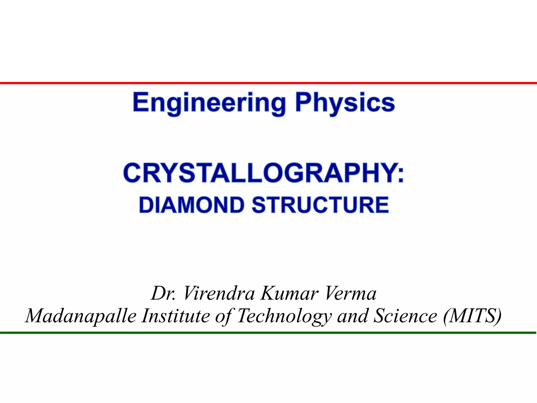 The document discusses the structure of diamond and face-centered cubic (fcc) unit cells, detailing atom positioning, space group, and atomic packing factor calculations. It highlights that the diamond cubic structure is formed by two interpenetrating fcc sublattices and provides formulas to compute the atomic packing factor. Additional resources and contact information are provided for further inquiries.