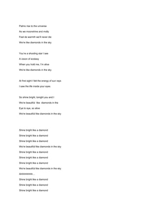 The document is lyrics to the song "Diamonds" by Rihanna. It repeatedly describes being beautiful and shining bright like diamonds in the sky, finding light and warmth in each other that will never die. Their love makes each other feel alive.