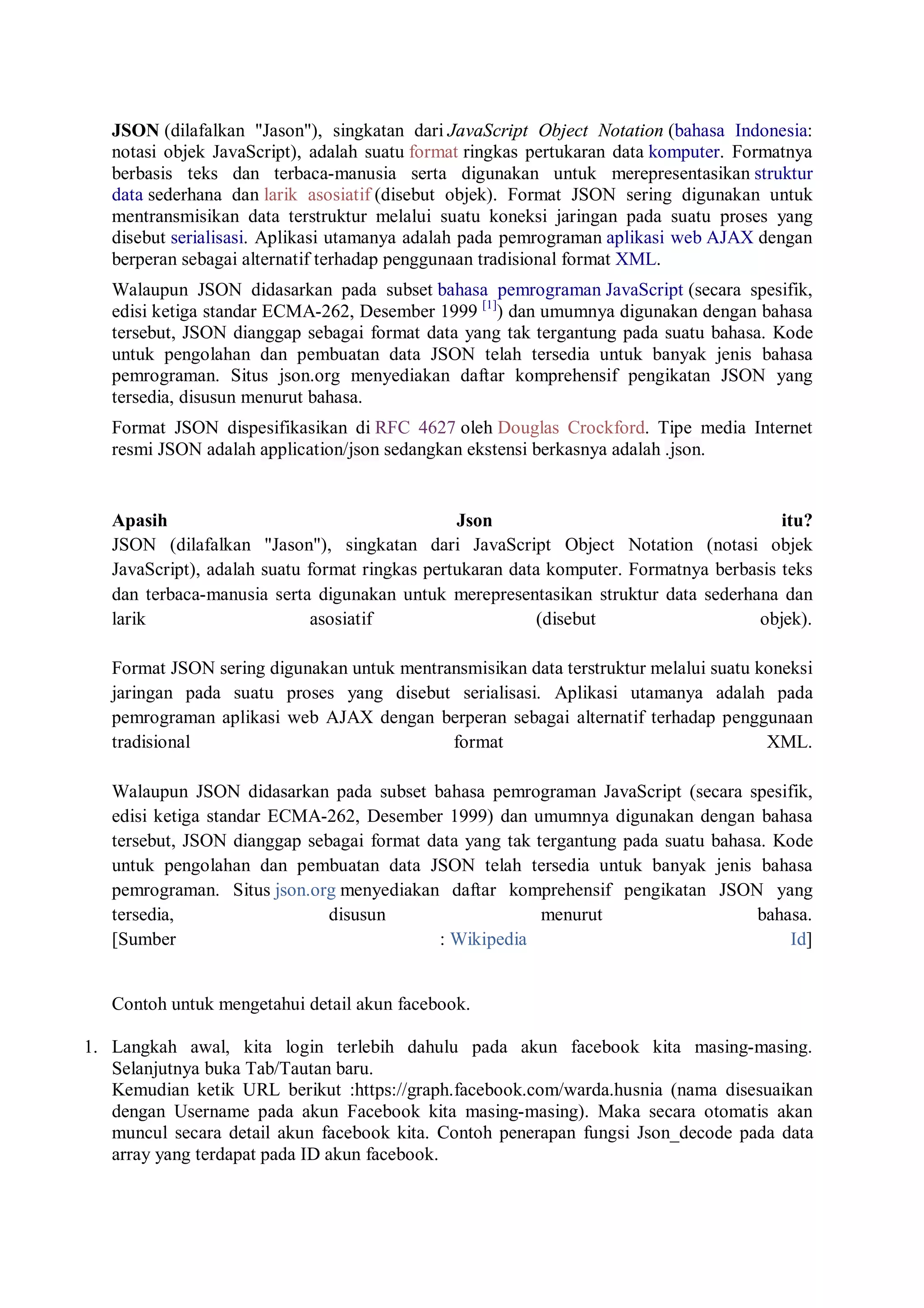 JSON (JavaScript Object Notation) adalah format ringkas untuk pertukaran data yang berbasis teks dan terbaca manusia, digunakan untuk merepresentasikan struktur data sederhana dan objek. Umumnya digunakan dalam pemrograman aplikasi web, JSON dianggap sebagai format data yang tidak tergantung pada bahasa pemrograman tertentu dan didukung oleh banyak bahasa. Selain itu, JSON dapat digunakan untuk mentransmisikan data terstruktur melalui jaringan dan memiliki tipe media resmi application/json.