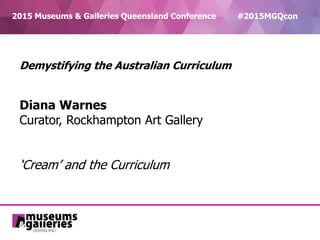 Diana Warnes, Curator of Rockhampton Art Gallery, discussed how the gallery's 2014 exhibition "Cream: Four Decades of Australian Art" aligned with the Australian Curriculum and could be used by teachers. The exhibition featured works by prominent Australian artists such as Margaret Olley, Russell Drysdale, Fred Williams, Jeffrey Smart, and Sidney Nolan. Warnes provided resources for teachers including activity sheets, promotional materials, and online teacher notes to demonstrate how the artworks can help teach the curriculum. She welcomed feedback and offered to mail explorer packs containing these resources to interested parties.