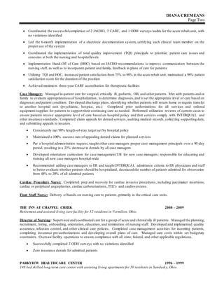 Diana Cremeans has over 25 years of experience in nursing, clinical education, case management, and leadership. She currently works as the Lead Case Manager at Select Medical/Cleveland Clinic Acute Inpatient Rehabilitation Hospital, where she oversees social workers and case managers. She also teaches as an adjunct instructor at Lorain County Community College. Previously, she held several director and manager roles involving clinical operations, case management, and nursing education at various hospitals and care facilities.