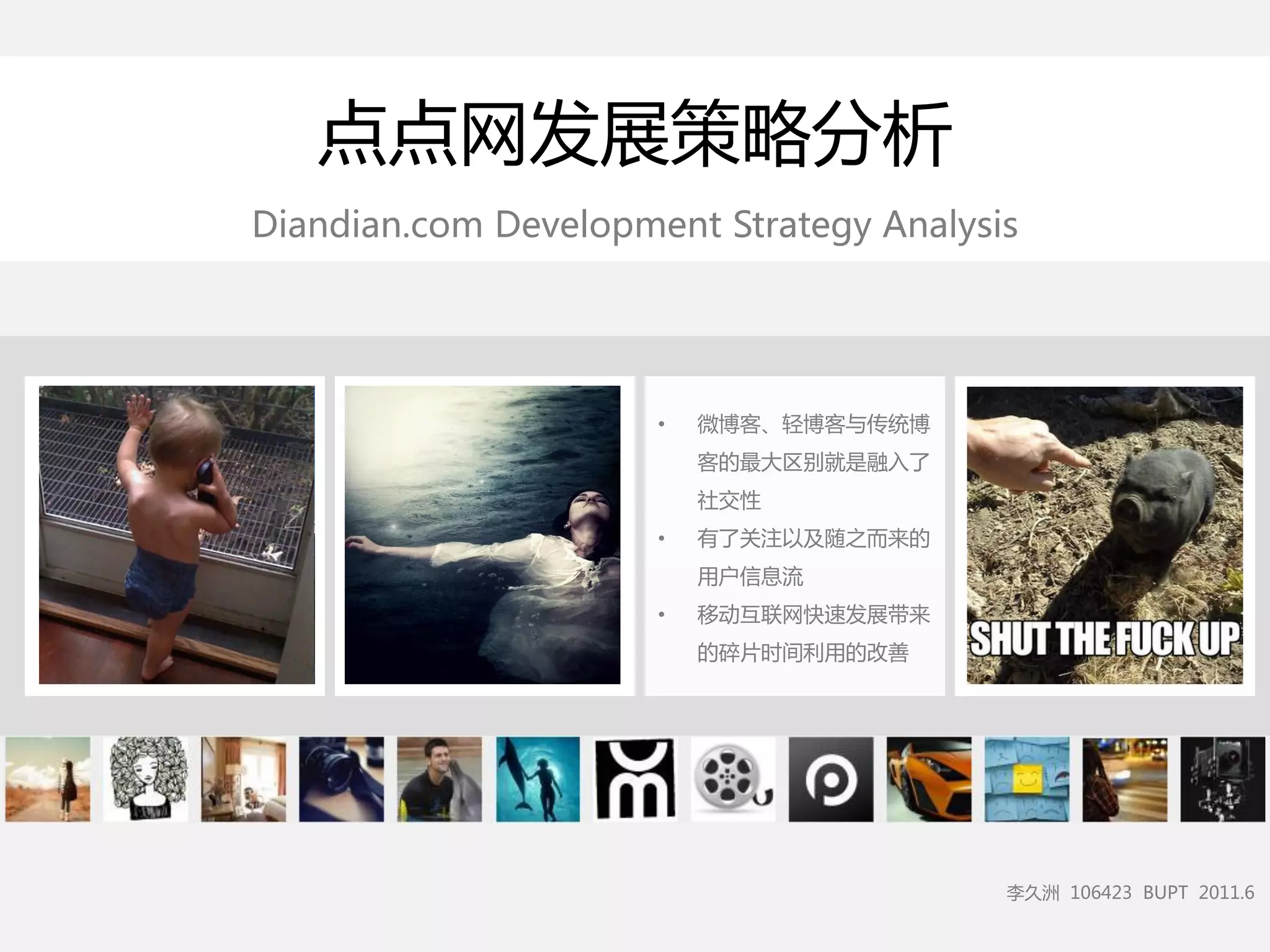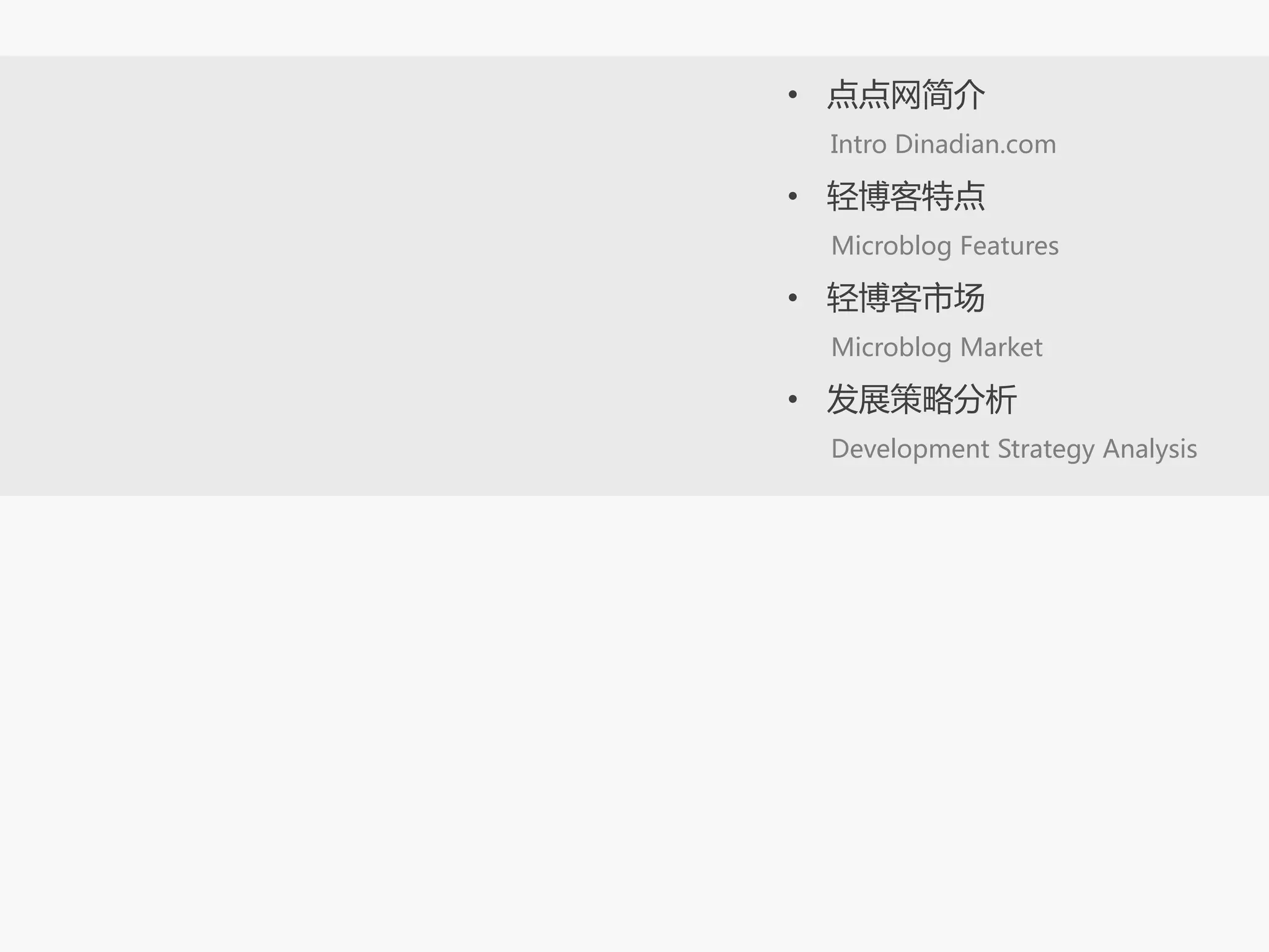 点点网是一个高质量内容发布和传播平台,致力于轻博客的快速发展,用户规模已突破100万。与其他社交平台相比,轻博客以内容为主导,通过简单易用的发布方式吸引用户,并预期未来会达到上亿注册用户。文档还讨论了点点网在市场竞争中的优势和劣势,以及在运营和产品发展方向上的建议。