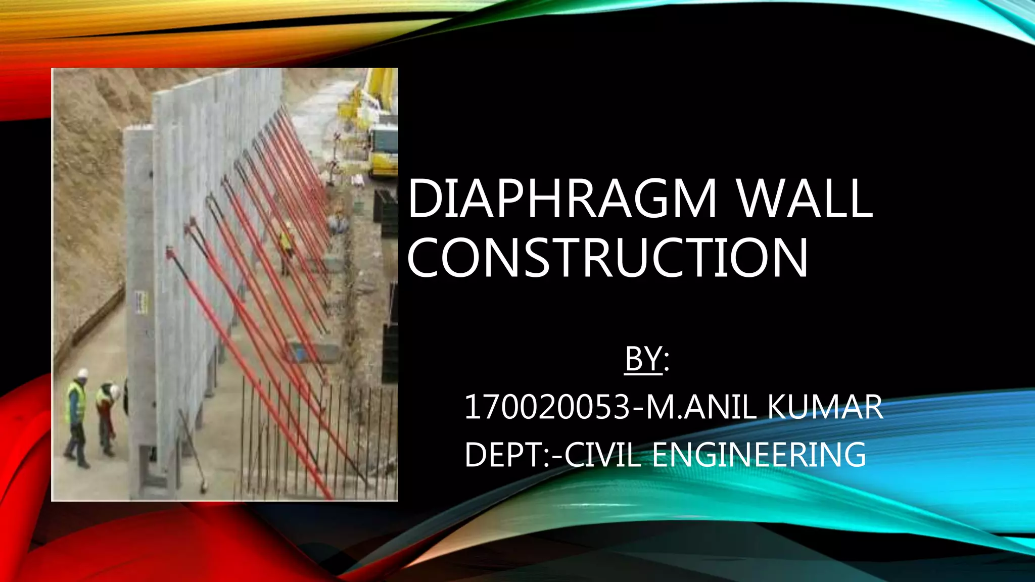 The document discusses the construction of diaphragm walls. It begins by defining a diaphragm wall as a continuous reinforced concrete structure constructed panel by panel using an in-situ method. It then describes the typical construction sequence which involves building a guide wall, excavating the trench using a grab, supporting the trench with bentonite slurry, placing reinforcement, and pouring concrete to form each wall panel. The document provides details on the equipment used and explains steps like slurry cleaning and panel joining. It concludes by listing some advantages of diaphragm walls and providing examples of some deep walls constructed worldwide.