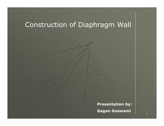 The document discusses the construction of diaphragm walls. Diaphragm walls are reinforced concrete walls constructed underground using an excavation technique that keeps the trench full of a bentonite slurry. They are commonly used for deep basements and where construction time is limited. The construction process involves excavating trenches in panels, installing stop ends between panels, placing reinforcement cages, and pouring concrete through a tremie pipe to displace the slurry. Proper installation and maintenance of the bentonite slurry is crucial to prevent trench collapse during excavation and concrete placement.