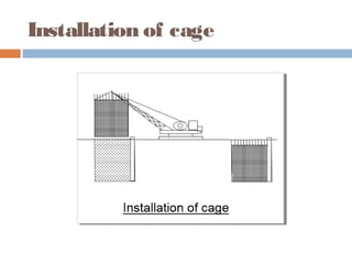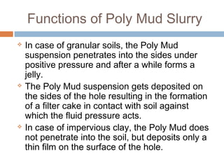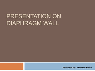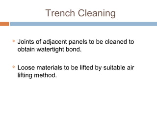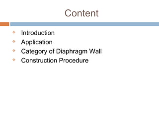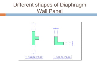A diaphragm wall is a reinforced concrete wall constructed underground using a slurry trench technique. A slurry trench involves excavating in a trench filled with a thick, viscous fluid called slurry that balances pressure to prevent trench collapse. Reinforcing cages are lowered into the trench and concrete is poured by tremie to displace the slurry. Diaphragm walls can be built close to existing structures, to great depths, and provide strong, watertight basement walls. However, they require specialized equipment and have high costs.