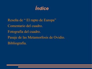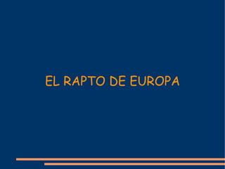 El documento resume la historia del rapto de Europa por Zeus en la mitología griega. Según la leyenda, Zeus se transformó en un toro blanco para ganarse la confianza de Europa, la hija del rey de Tiro y Sidón, y luego la llevó nadando hasta la isla de Creta, donde tuvieron tres hijos juntos. El documento analiza una pintura de este episodio mitológico y también incluye un pasaje de las Metamorfosis de Ovidio que describe el rapto.