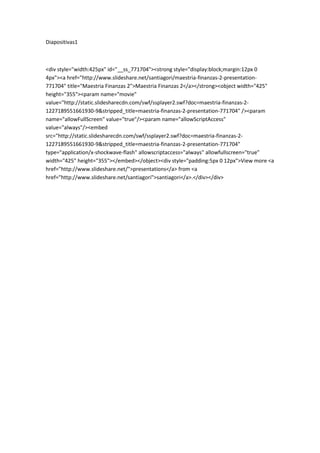 The document contains a presentation titled 'maestria finanzas 2,' which can be viewed on SlideShare. It includes an embedded player for viewing the presentation directly. Additionally, it provides links to more presentations from the user 'santiagori' on SlideShare.