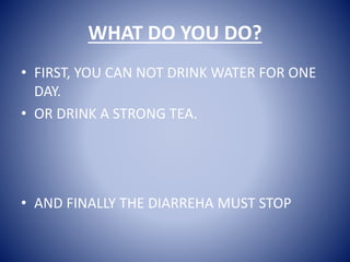 Diarrhea can be treated by not drinking water for a day or drinking strong tea to stop the diarrhea. The document recommends not drinking water for one day as the first step and drinking strong tea as an alternative second step, with the goal of stopping the diarrhea.