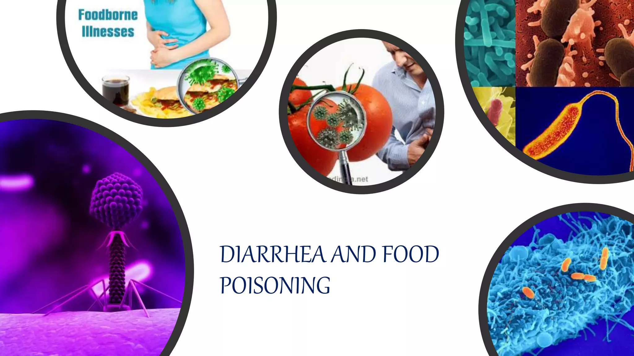 This document discusses diarrhea and food poisoning. It defines foodborne diseases as illnesses caused by pathogens from contaminated food. Common symptoms include nausea, vomiting, abdominal cramps and diarrhea. Diarrhea is characterized as an increase in bowel movement frequency or volume. The document outlines various types of food contaminants including biological, chemical and physical contaminants. It describes different bacterial foodborne illnesses such as salmonellosis, staphylococcus, and E. coli. Laboratory diagnosis methods are summarized including microscopy, culture techniques and serology to identify causative agents.