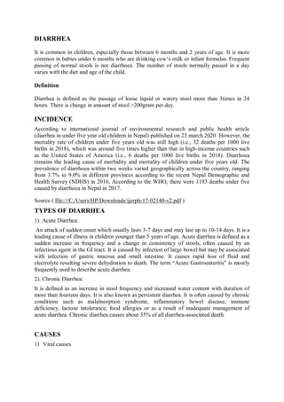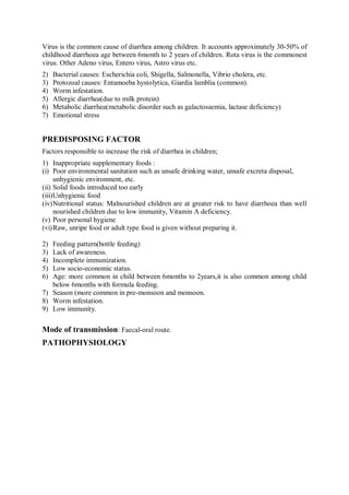 Diarrhea is common in children under 2 years old and is usually caused by viral or bacterial infections. It can lead to dehydration if fluid losses are not replaced. Dehydration is classified as none, some, or severe based on signs like thirst, skin pinch, and sunken eyes. Treatment involves oral rehydration solution to replace fluids based on the dehydration classification. For severe dehydration, IV fluids are given quickly followed by oral fluids. Preventing diarrhea involves exclusive breastfeeding, hand washing, safe water and food, and immunizations. Managing diarrhea at home includes extra fluids, continued feeding, zinc supplementation, and seeking care for danger signs.