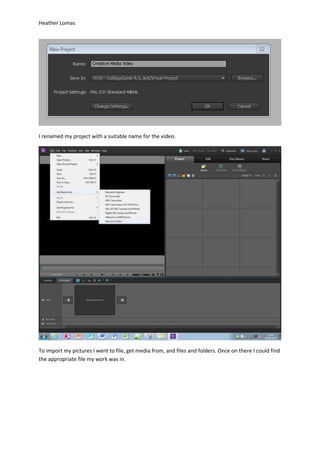 The document describes Heather Lomas creating a video project in Premiere Elements. She imports various video clips, images, and a backing track. Heather edits the clips, adding effects like speeding up and slowing down parts. She creates slideshows of images and imports clips of interviews. Heather adds titles and a repeating college logo. After editing clips and arranging the timeline, she exports the finished video project.