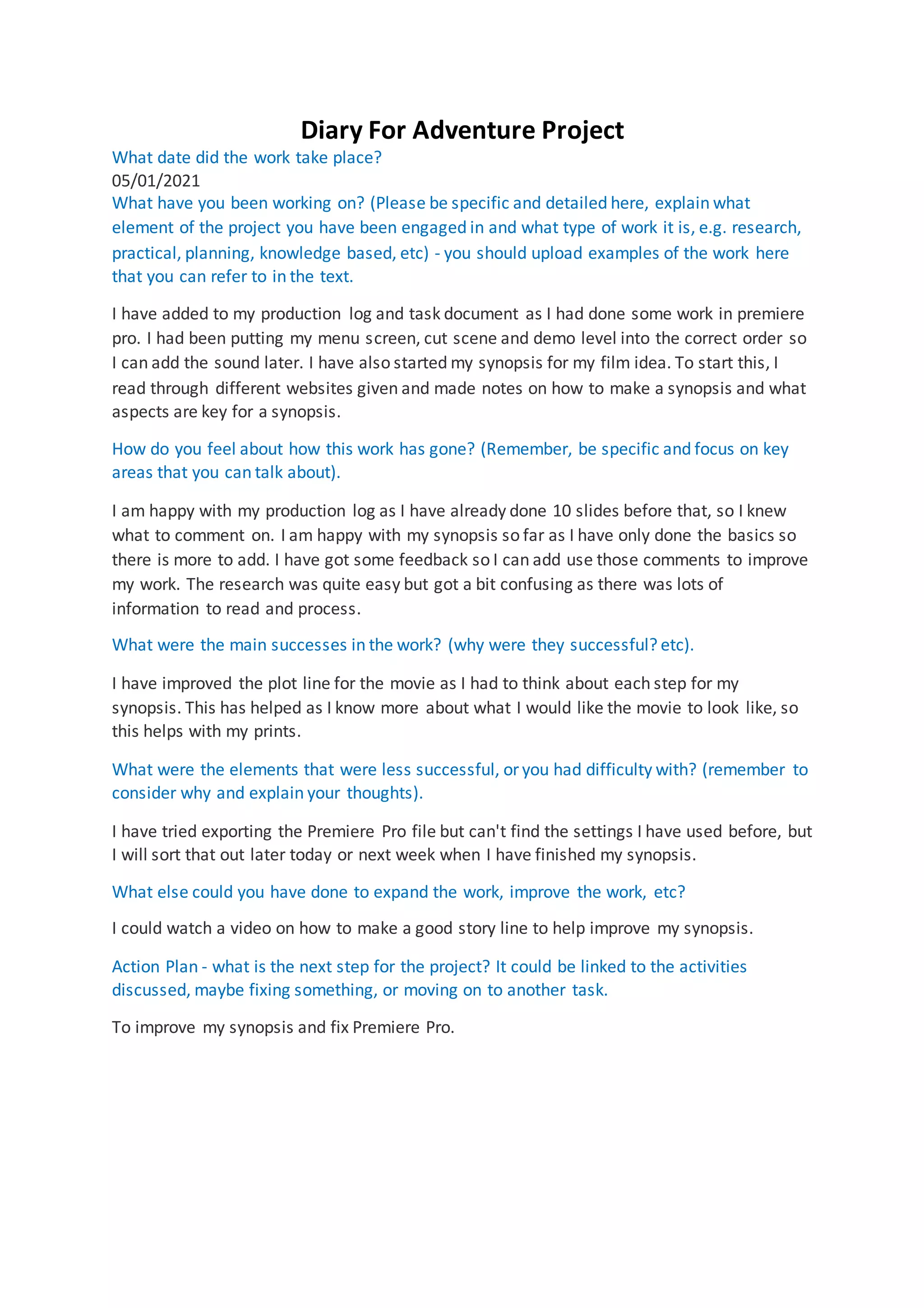 The document summarizes the diary entries for an adventure project from January 5th to January 13th. It describes the work completed each day, including improving a synopsis, adding sound effects and music to video sequences, planning print materials, and researching design software. It indicates feelings of success in completing tasks like the synopsis and soundtrack. Difficulties included figuring out the next steps and starting musical ideas. The next steps are to take photos for print materials and create mockups.