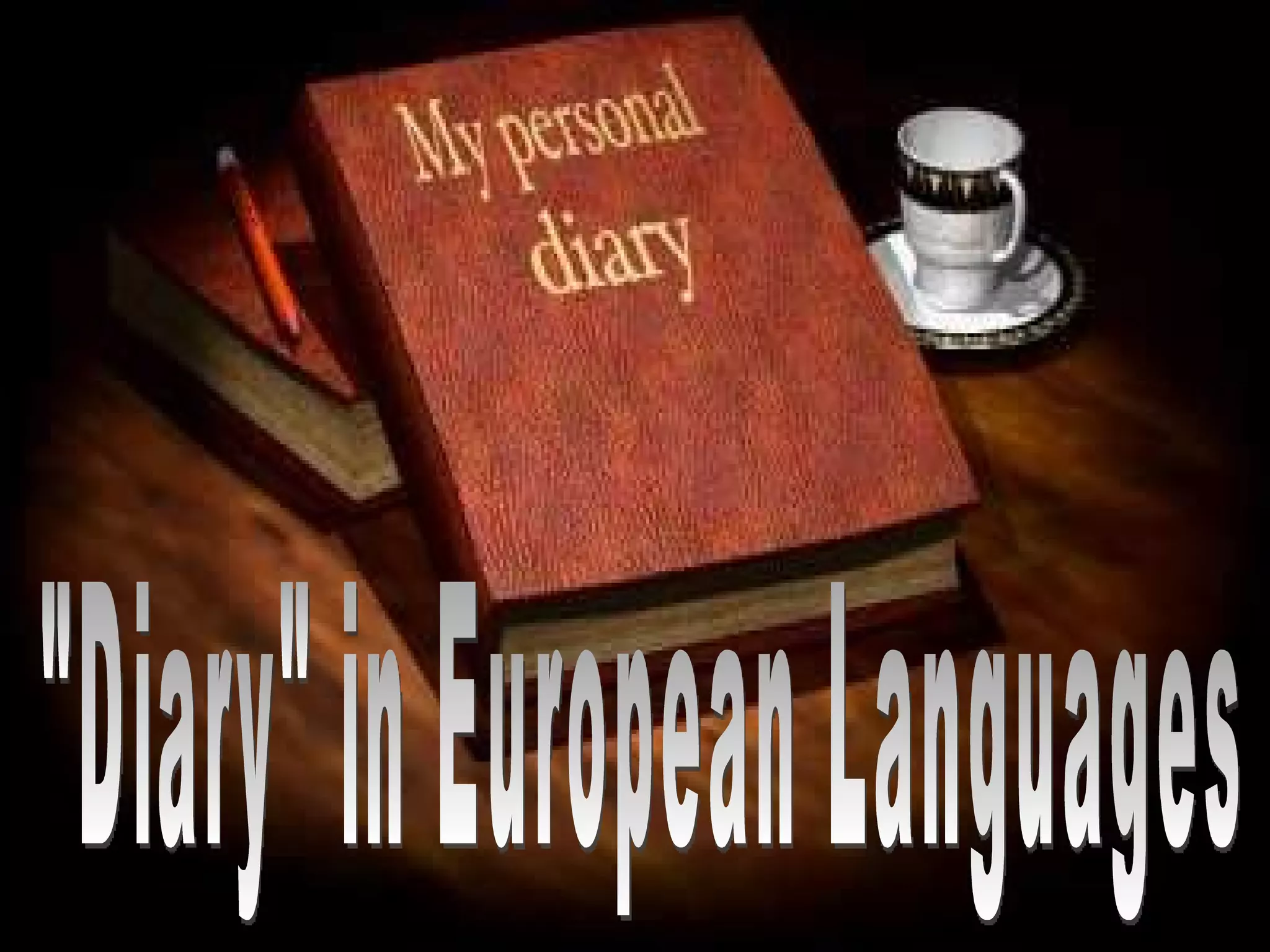 This document lists the word for "diary" in several European languages. In Romanian it is "jurnal", in Polish "Terminarz", in German "Tagebuch", in Italian "diario", in French "journal", in Greek "ημερολόγιο", in Bulgarian "Дневник", in Finnish "päiväkirja", in Czech "diář", and in Spanish "diario".