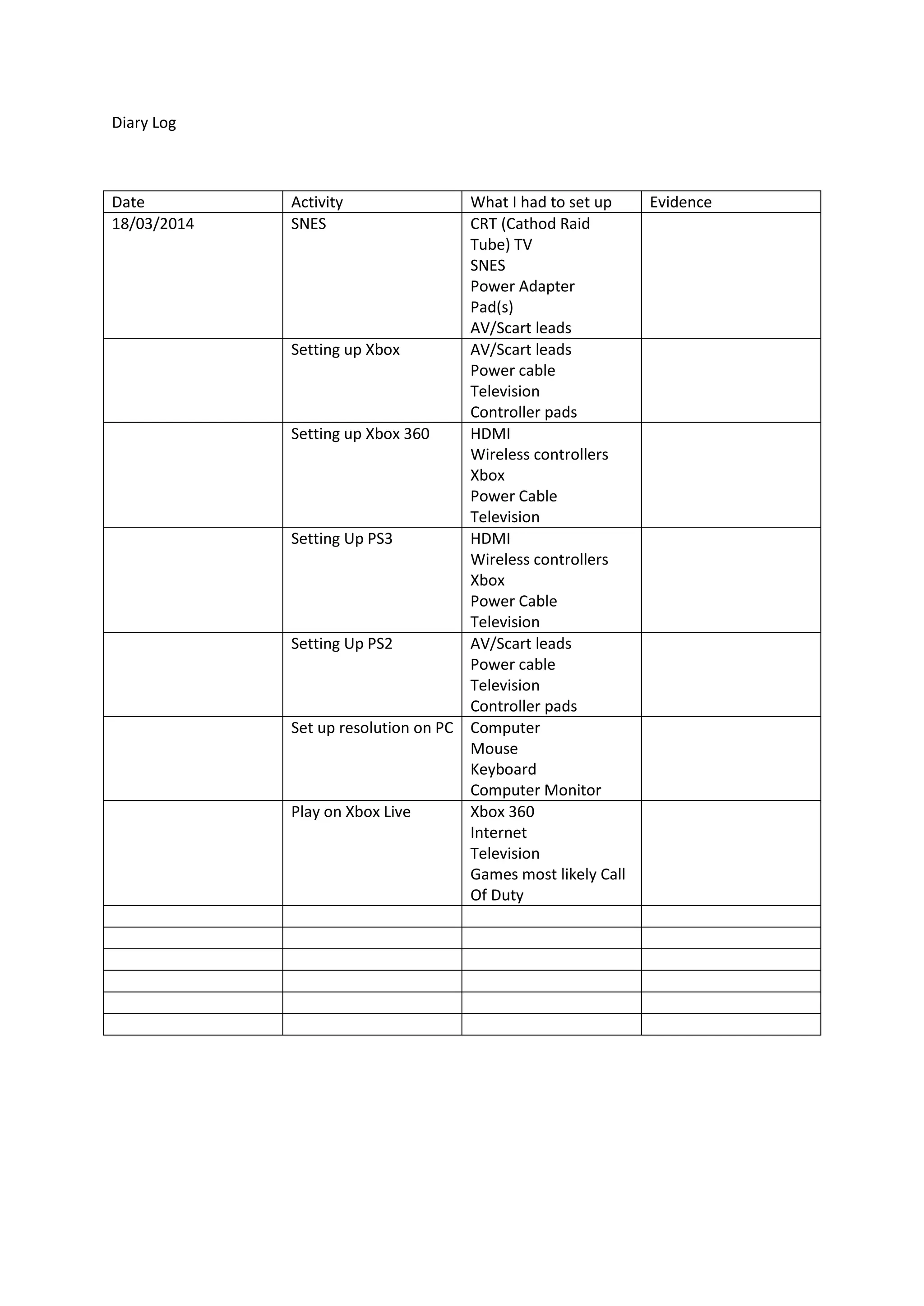 The diary log details the setup of various gaming consoles over multiple dates, including connecting a Super Nintendo Entertainment System to a CRT TV using an AV cable and controller pads on March 18th, 2014, connecting an original Xbox and Xbox 360 to a TV using AV cables, power cables, and wireless controllers, and connecting a PlayStation 2 and 3 to a TV using HDMI or AV cables, power cables, wireless controllers, and setting the resolution on a PC with a monitor, mouse, and keyboard.