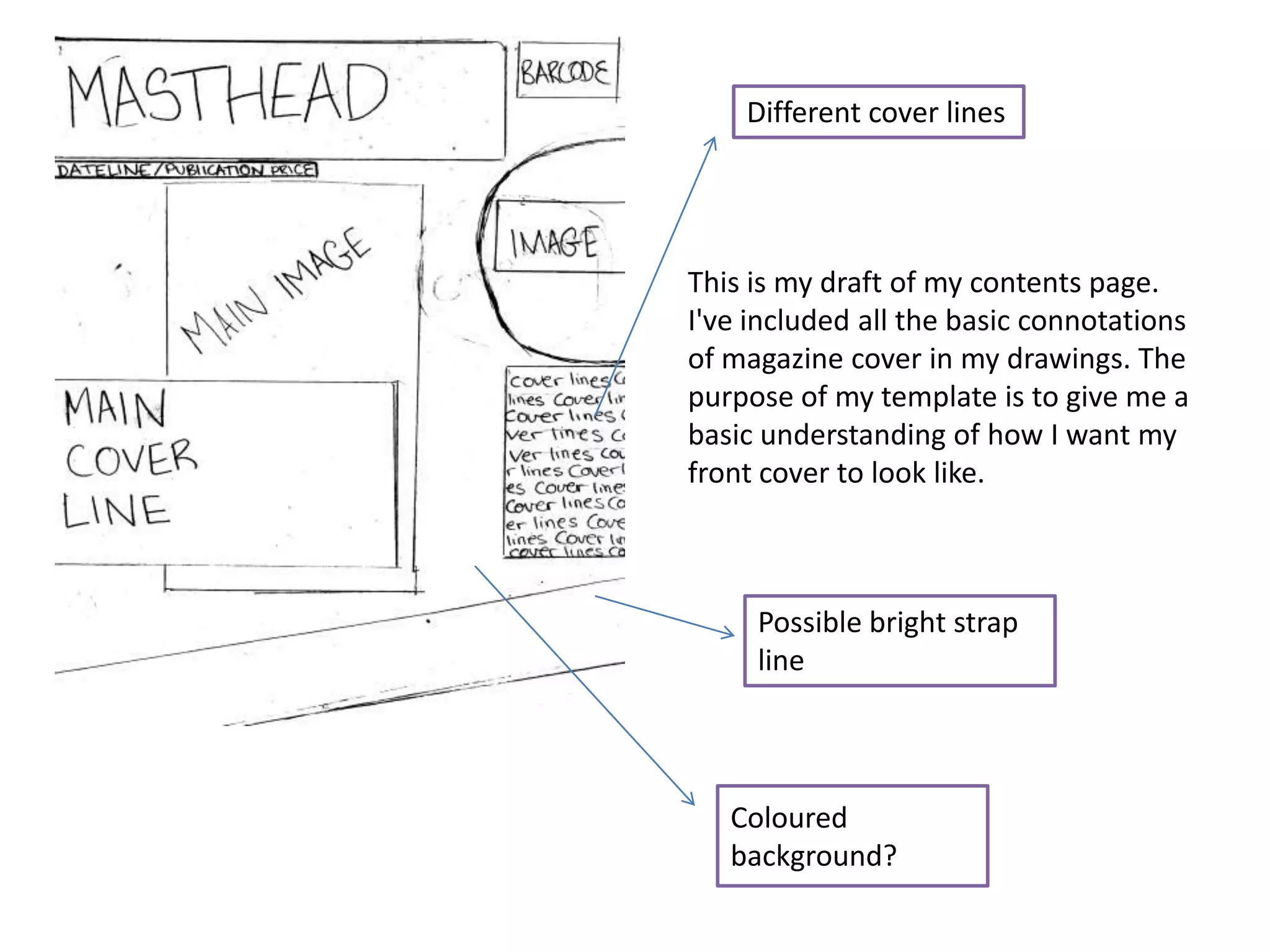 This document describes the process of designing a magazine cover and contents page. The author created draft sketches and templates in Photoshop to plan layouts before building the actual pages in InDesign. InDesign proved more useful than Photoshop for the task as it included tools tailored to organizing text and images across a page. Frames, grids, and layers helped the author strategically position all elements, and test cover designs were refined through techniques like blurring images and experimenting with fonts and backgrounds.