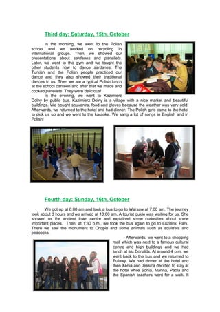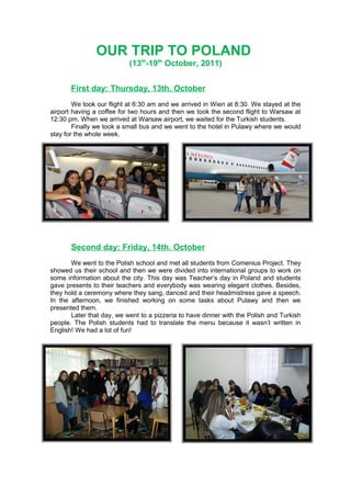 The document summarizes a group's trip to Poland from October 13-19, 2011. Over the course of the week-long trip, the group visited several cities and sites including Warsaw, Pulawy, Kazimierz Dolny, Lublin, and participated in cultural exchanges with Polish students. They learned about Polish culture through dancing, cooking traditional foods, and giving presentations on their home countries. The trip provided an opportunity for the students to experience Poland's history, make new international friends, and represent their own cultures abroad before returning home on the last day.