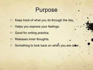 Keeping a diary has several purposes such as tracking daily activities, expressing feelings, and practicing writing. There are different types of diaries like general diaries about daily life, feelings diaries, food diaries, and travel diaries. Blogs are online diaries that can be used to share experiences. Diaries should use past tense to reflect on past events. Writing in a diary has no wrong way and can be whatever the writer wants or needs it to be.