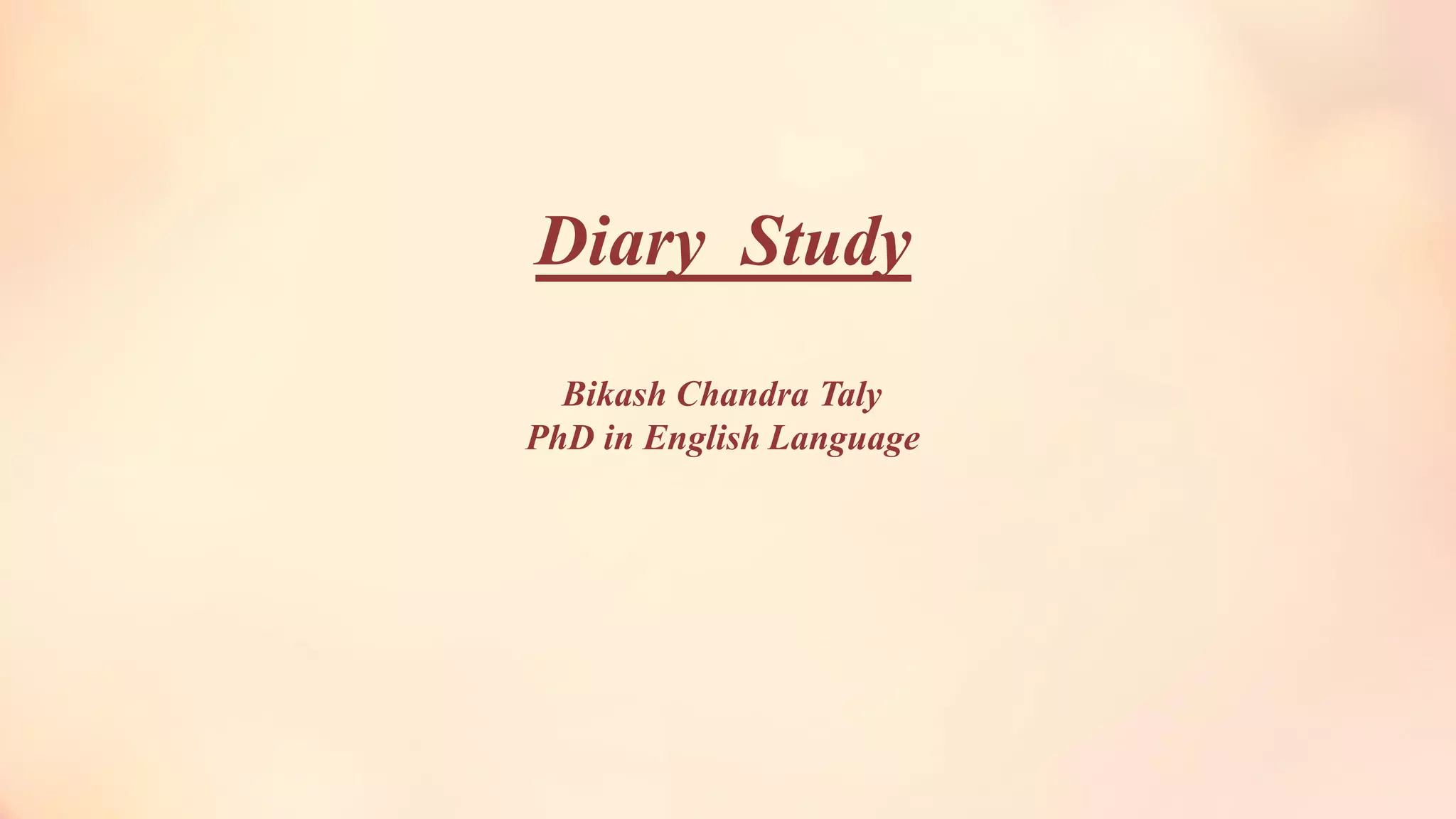 Diary studies involve language learners or teachers keeping journals over time using introspection. This allows insight into aspects of the language learning process not normally accessible. A few published diary studies have looked at different aspects of the learning and teaching process, but findings are difficult to compare due to small sample sizes. To analyze diaries, one should consider the content, context, and form of the narrative. Diaries provide qualitative data about factors influencing individuals' language learning experiences and processes.