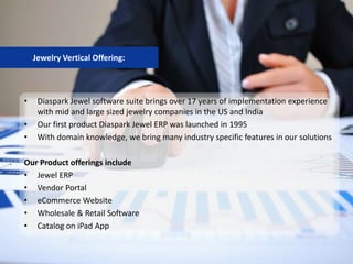Diaspark offers a comprehensive suite of jewelry software tailored for mid to large-sized jewelry companies, boasting 17 years of implementation experience. Key products include Jewel ERP for inventory and order management, a vendor portal, wholesale and retail solutions, and an e-commerce website, all designed to enhance operational efficiency. The company has a global presence with a focus on quality and customer service, supported by a strong team of over 650 professionals.