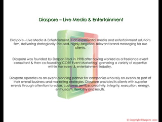 Diaspore is an experiential media and entertainment firm that plans events for companies to use in marketing strategies. Founded in 1998, it provides full-service event planning including concept development, production, talent management, and measurement of results. Diaspore works on a variety of live and visual media events across multiple industries including fashion, sports, weddings, conferences and more.