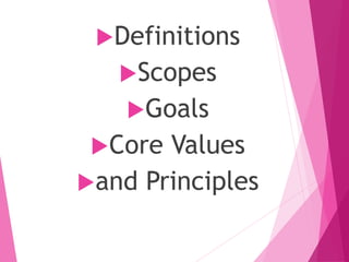 Counseling involves a personal relationship between a professionally trained counselor and client aimed at meeting needs and problems. The goals of counseling include development, prevention, enhancement, remediation, exploration, reinforcement, cognitive, physiological, and psychological goals. Counseling covers personal, social, cognitive, behavioral, psychological, emotional, spiritual, health, and occupational aspects, but not clinical cases requiring medication/psychotherapy. Core values include respecting human dignity, partnership, autonomy, responsible caring, personal integrity, and social justice. Principles include reassurance, releasing tension, respect, empathy, clarified thinking, reorientation, listening skills, clarification/confrontation/interpretation, and transference/countertransference.