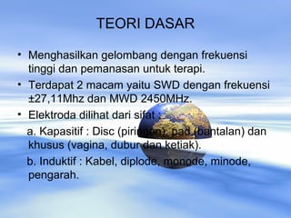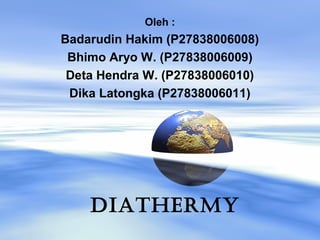 Diathermy merupakan terapi yang menggunakan gelombang elektromagnetik frekuensi tinggi untuk mengurangi rasa nyeri. Alat ini memiliki dua jenis, yaitu SWD dan MWD, serta elektroda dengan sifat kapasitif dan induktif. Di dalamnya terdapat rangkaian pengontrol frekuensi dan keamanan yang bekerja dengan mengubah tegangan dari sumber listrik menjadi tegangan tinggi untuk memanaskan bagian tubuh yang diobati.