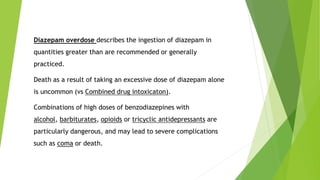 Diazepam poisoning occurs when excessive amounts are ingested. Symptoms develop rapidly and include impaired motor function, slurred speech, and nausea. Severe overdoses can cause prolonged coma, respiratory depression, and cardiac arrest. Treatment involves medical observation, supportive care, and intubation if needed to protect the airway. Flumazenil is an antidote but due to risks of withdrawal, it is rarely used and supportive care is usually sufficient.