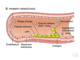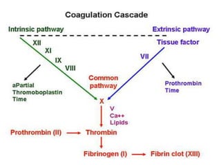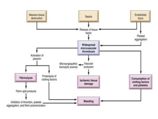 This document summarizes a presentation on disseminated intravascular coagulation (DIC). It begins with an overview of hemostasis and the three major systems involved: the vessel wall, platelets, and the coagulation cascade. It then discusses the pathophysiology of DIC, noting that DIC results from the activation of coagulation without localization arising from various causes. Common causes of DIC include sepsis, trauma, vascular disorders, and cancer. The presentation reviews laboratory tests for diagnosing DIC, including platelet count, D-dimer, PT, PTT, fibrinogen, and tests for antithrombin and proteins C and S. It also discusses diagnostic criteria from various guidelines and introduces thromboel