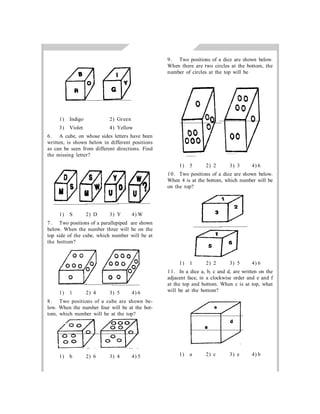 The document contains 30 multiple choice questions about cubes, dice, and their positions and orientations. The questions involve identifying numbers, colors, or letters that would be in certain positions based on the given orientations of cubes or dice. Some questions also provide additional information about the coloring or labeling of different sides of cubes.