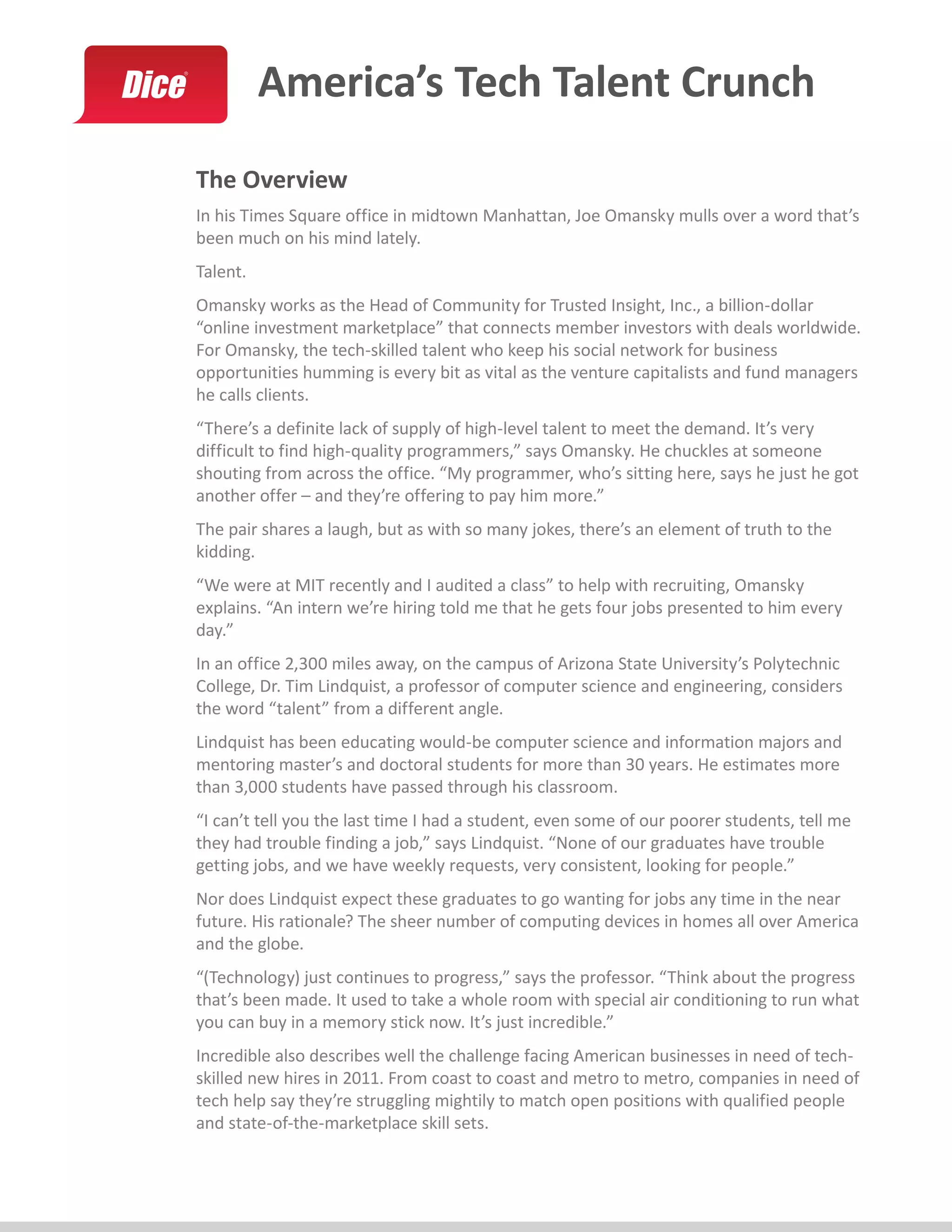 America is facing a shortage of tech talent as demand for skilled programmers and developers outstrips supply. Job openings in tech fields have increased 60% in the past two years while the number of computer science graduates has declined. This talent gap exists across many states, particularly in tech hubs like California, New Jersey, Texas, New York, and Massachusetts, where there are multiple job openings for every graduate. The shortage is fueling intense competition for skilled workers and increased salaries in the tech sector.
