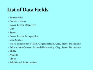 Dice.com provides data scraping services to collect contact information from job sites and company career pages. They offer a free sample of their high-quality database that contains fields like name, address, work history, education, and skills sourced from over 30 sites. Potential clients can contact them by email at reach2ry@gmail.com to learn more.