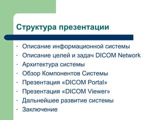 Документ описывает информационную систему «dicom network» для обработки медицинских изображений в формате DICOM, созданную для повышения удобства и безопасности в медицинской практике. Основные задачи системы включают упрощение доступа к исследованиям, решение проблем авторизации и документирования, а также создание надежного архива. Архитектура системы имеет модульный характер, что позволяет адаптировать функциональность под потребности различных медицинских учреждений.