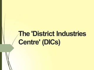The District Industries Centre (DIC) program was started in 1978 by the central government to provide support for small, cottage, and village industries in each district. The DIC serves as a single point of contact for entrepreneurs to access necessary services and facilities like feasibility studies, credit, equipment, raw materials, and industrial clusters. The objectives of the DIC include accelerating industrialization, promoting rural industries, achieving economic equality across regions, and providing information on government schemes. The DIC organizes training, provides SSI registration, helps entrepreneurs access subsidies and assistance, and acts as a liaison between entrepreneurs and banks. The state government provides various incentives for new industries like investment subsidies, entry tax exemptions, stamp duty concessions,