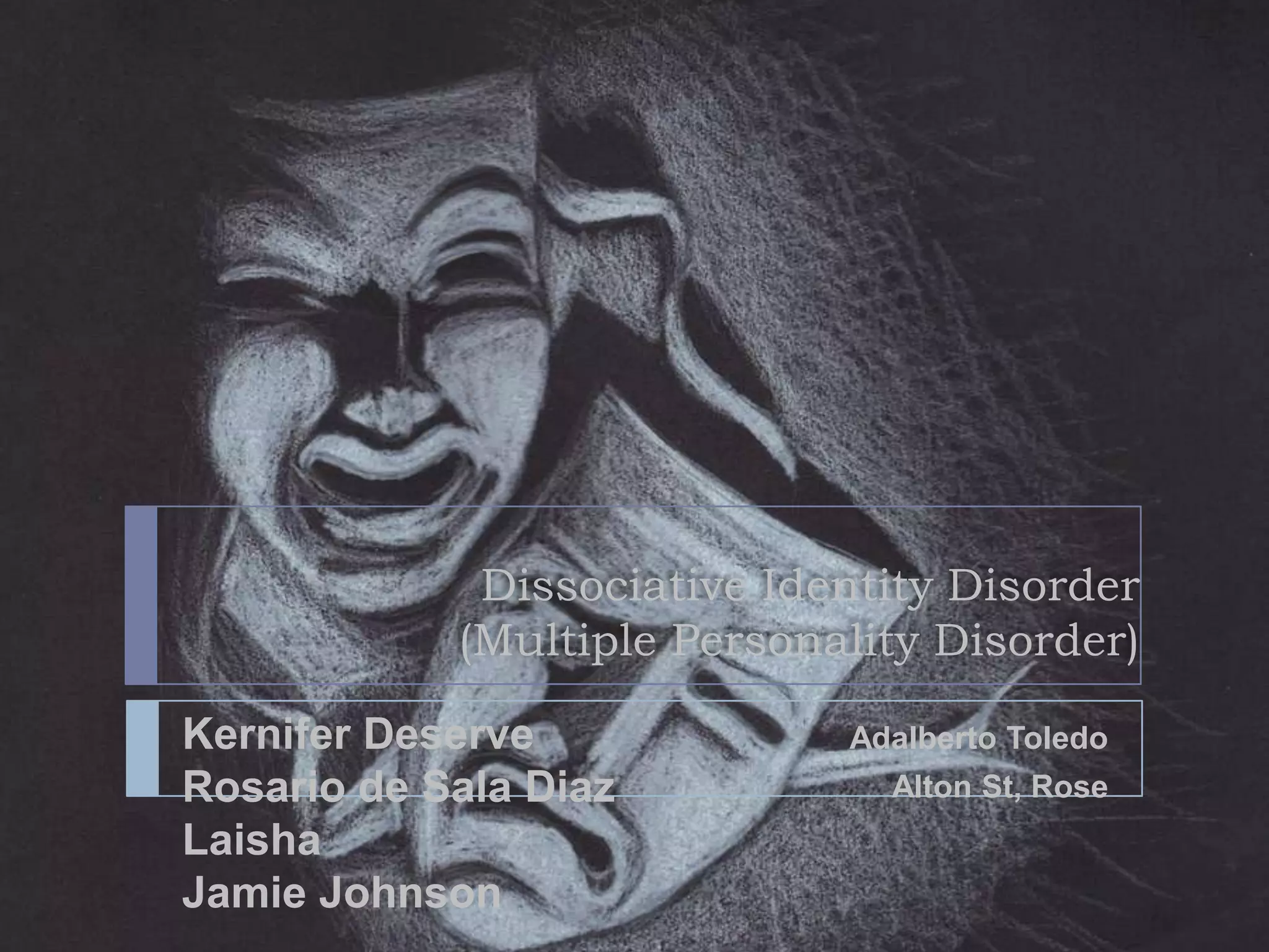 This document provides information on Dissociative Identity Disorder (DID), formerly known as Multiple Personality Disorder. It discusses skepticism around DID and explains that dissociation exists on a spectrum from mild daydreaming to more severe identity fragmentation. The document outlines characteristics of DID like disturbances in identity, existence of distinct alters, and types of relationships between alters. Causes like childhood trauma and abuse are explored, as are popular portrayals of DID in films and books. Assessment tools, integration in therapy, and two case studies of individuals with DID are summarized.