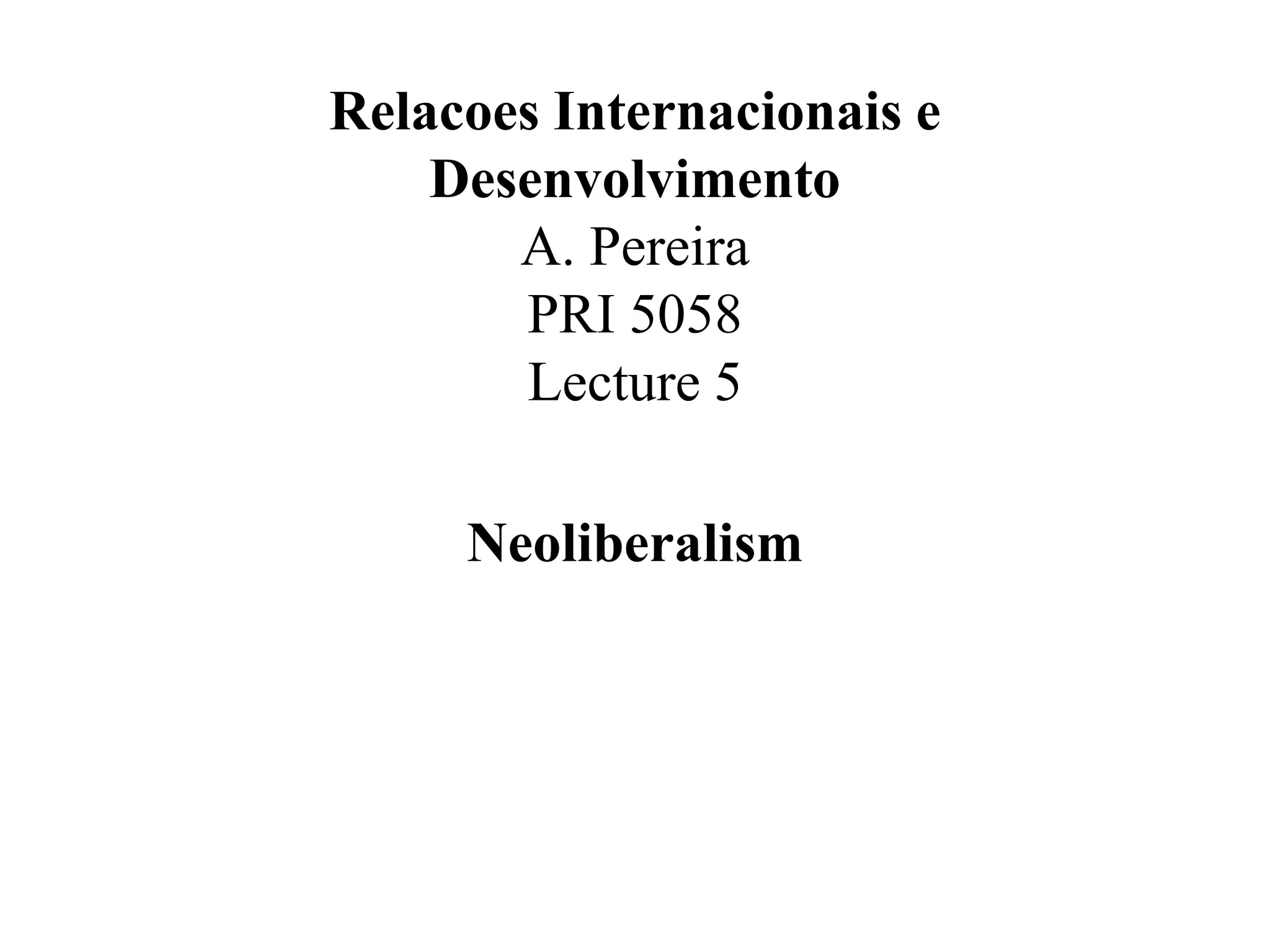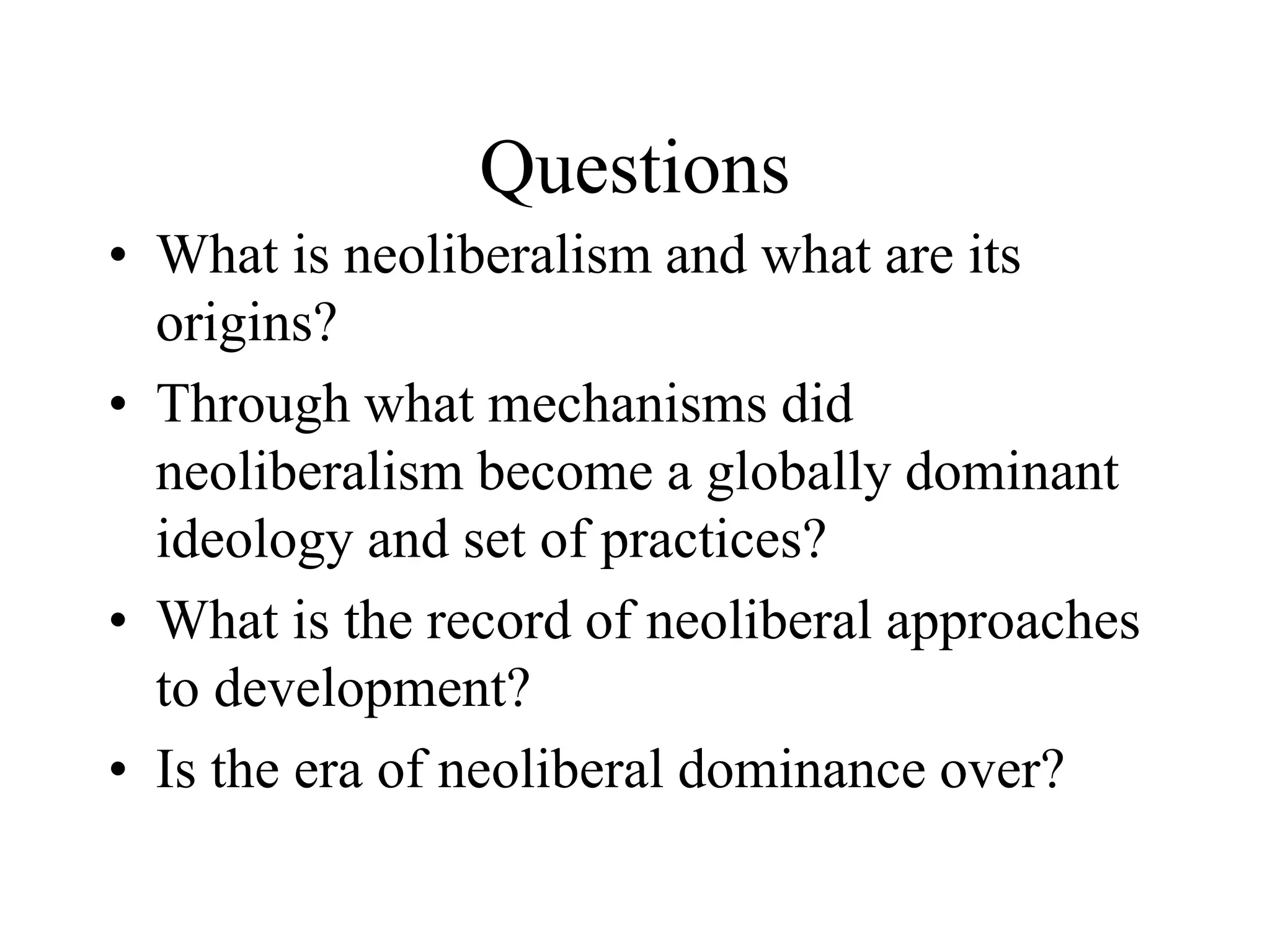 Neoliberalism emerged in the late 20th century as a response to Keynesian economics and the stagflation of the 1970s. It advocated for reducing state involvement in markets and increasing privatization, deregulation, and trade liberalization. While it led to some economic growth, it also increased inequality and failed to significantly reduce poverty or strengthen state capacity in many places. The 2008 financial crisis undermined confidence in neoliberal policies, though market-oriented reforms still influence development approaches today.