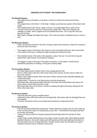 The human body contains many fascinating skeletal, muscular, circulatory, nervous, immune, digestive, and respiratory systems. The skeletal system includes over 200 bones, with the pelvis being the largest and the stirrup in the ear being the smallest. The muscular system contains over 600 muscles, with the gluteus maximus being the biggest and the stapedius in the ear being the tiniest. The circulatory system transports blood throughout the body via the heart at a rate of over 3 billion beats in a lifetime. The nervous system includes the wrinkled walnut-shaped brain and spinal cord protected by cerebrospinal fluid. The immune system uses skin secretions, tears, mucus and lymph nodes to fight