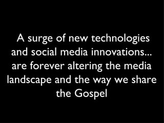 The document discusses how new technologies and social media have changed how information is shared and consumed, noting statistics on the growth of internet devices and online media platforms. It also presents findings that many young people perceive the church negatively and find community elsewhere, highlighting the need for new approaches in sharing the gospel online and through mobile platforms. MediaSpan Online for Ministry is introduced as a partner that can help religious organizations adapt their online strategies and tools.