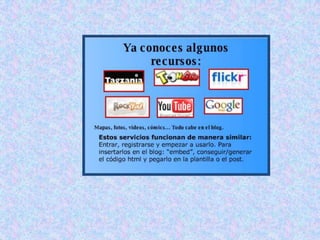 El artículo opost es la unidad de información/narración en un blog. Y como medio digital, participa de las propiedades y recursos del hipertexto. Los enlaces y referencias añaden información adicional sin alargar el contenido visual, la ligereza y la agilidad del post. Además, van directamente a las fuentes de la información, creando así una red de sitios, y conformando el ecosistema de la blogosfera.La imagen o elemento multimedia asociado al post aporta información visual muy potente, ya que admite cualquier formato gráfico, audio y también video, y pueden referenciarse archivos alojados en otras webs.Los ejemplos más conocidos son los repositorios multimedia gratuitos, como Flickr, YouTube, Odeo o Google, cuyos recursos se pueden visualizar en las propias páginas de nuestro blog. Eso sí: respetando siempre la procedencia y la autoría de los materiales, mediante la correspondiente cita y enlace.Ing. Telmo Viteri - tviteri@pucesa.edu.ec