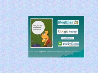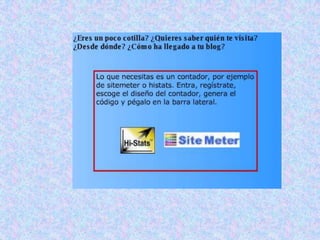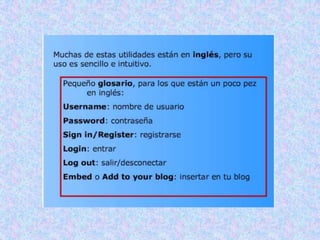 Aunque la aparienciavisual depende del diseño de la plantilla utilizada, la página principal de un blog presenta elementos comunes. Desde ella se puede acceder a:• Entradas o artículos ordenados cronológicamente, comenzando por los más actuales.• Comentarios a los distintos artículos.• Calendario, o archivos por año/mes/día.• Categorías o temas en que se clasifican los artículos.• Blogroll, o repertorio de enlaces a otros blogs o sitios web.Ing. Telmo Viteri - tviteri@pucesa.edu.ec