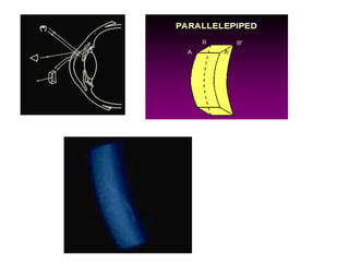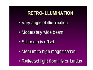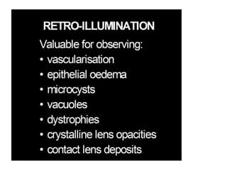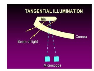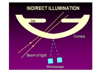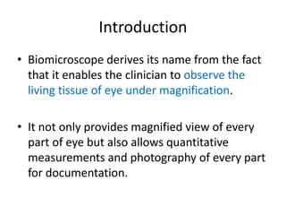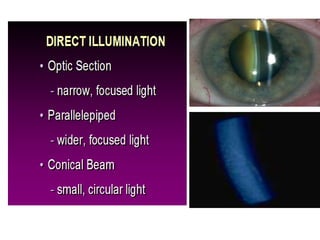 The document discusses the slit lamp biomicroscope, an important tool in optometry. It describes the history and development of the slit lamp, including key contributors. The basic components and functioning of the slit lamp are explained, including the illumination and observation systems. Different types of slit lamps and various illumination techniques used with the slit lamp like diffuse, direct, retro-illumination and their applications are outlined. The document also mentions the clinical uses of the slit lamp for diagnostic and therapeutic purposes.