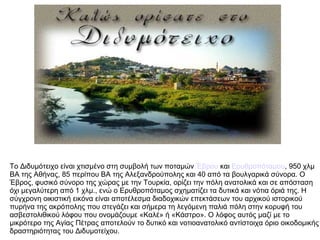 Tο Διδυμότειχο είναιχτισμένο στη συμβολή των ποταμών Έβρου και Ερυθροπόταμου, 950 χλμ