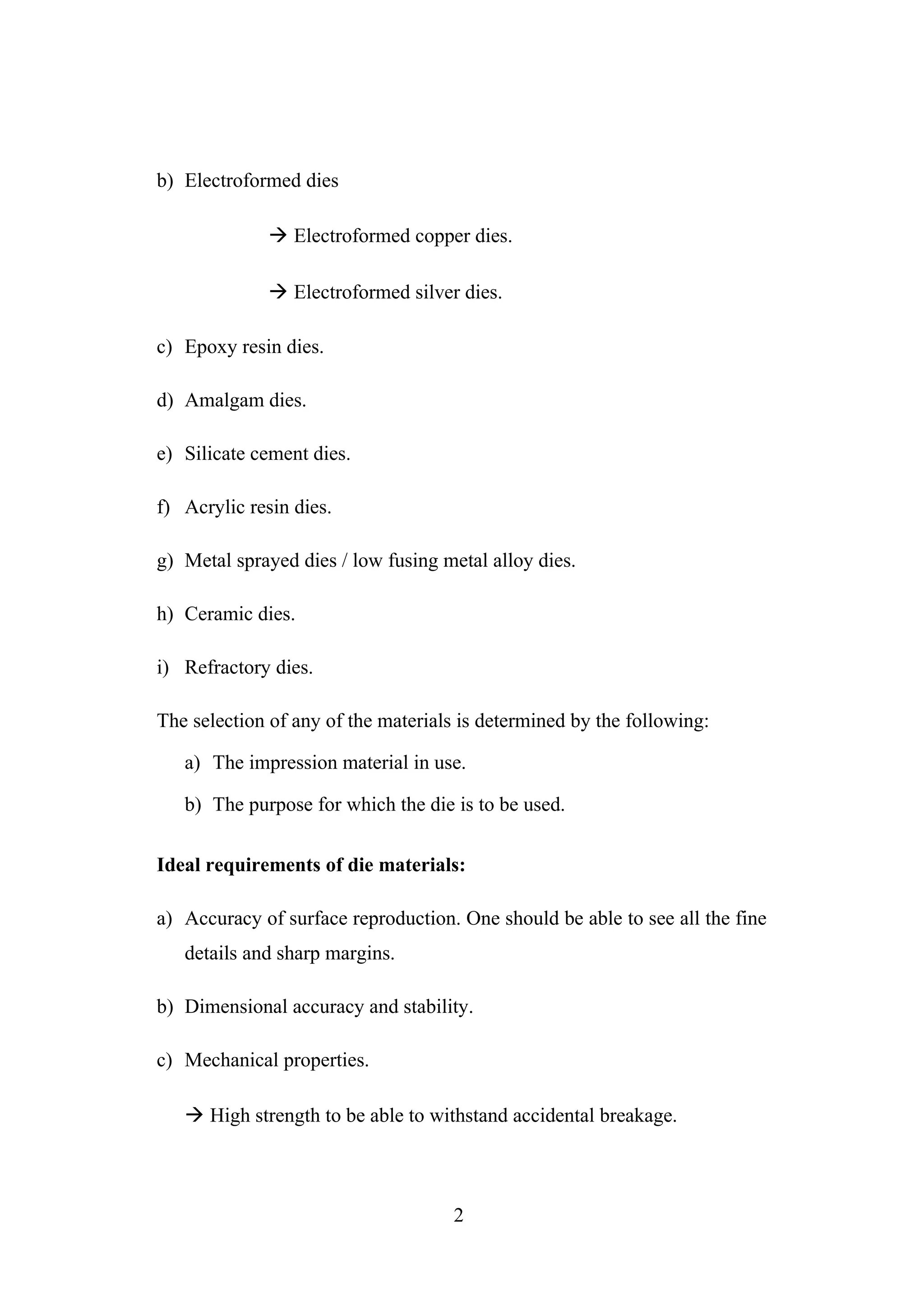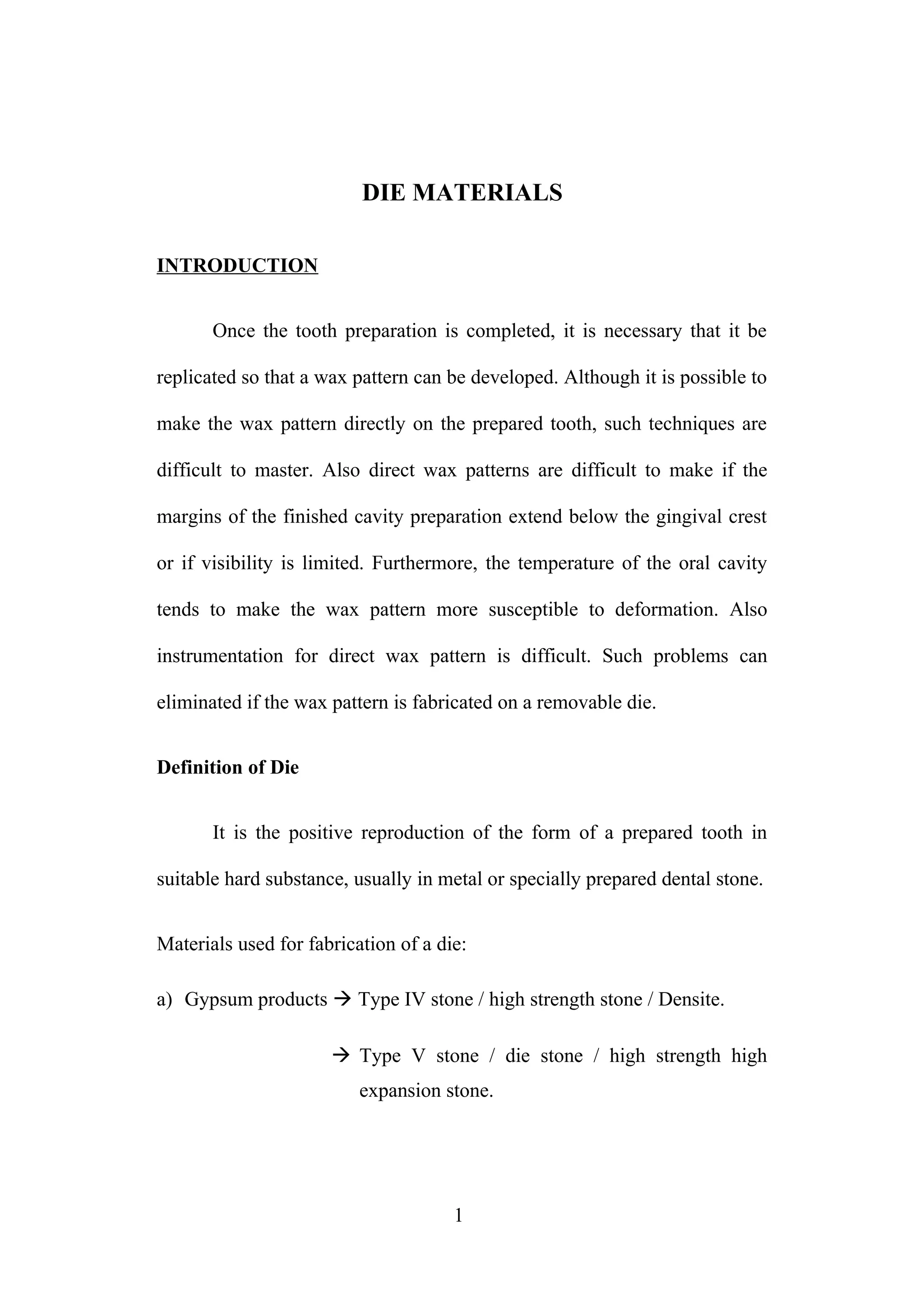 The document discusses the preparation and use of die materials in dentistry, focusing on the replication of tooth preparations for wax patterns. It outlines various die materials, such as gypsum products, electroformed dies, and epoxy resin dies, and their ideal properties, fabrication methods, and manipulation techniques. The document also details the setting processes, physical properties, and factors affecting the performance of these materials.