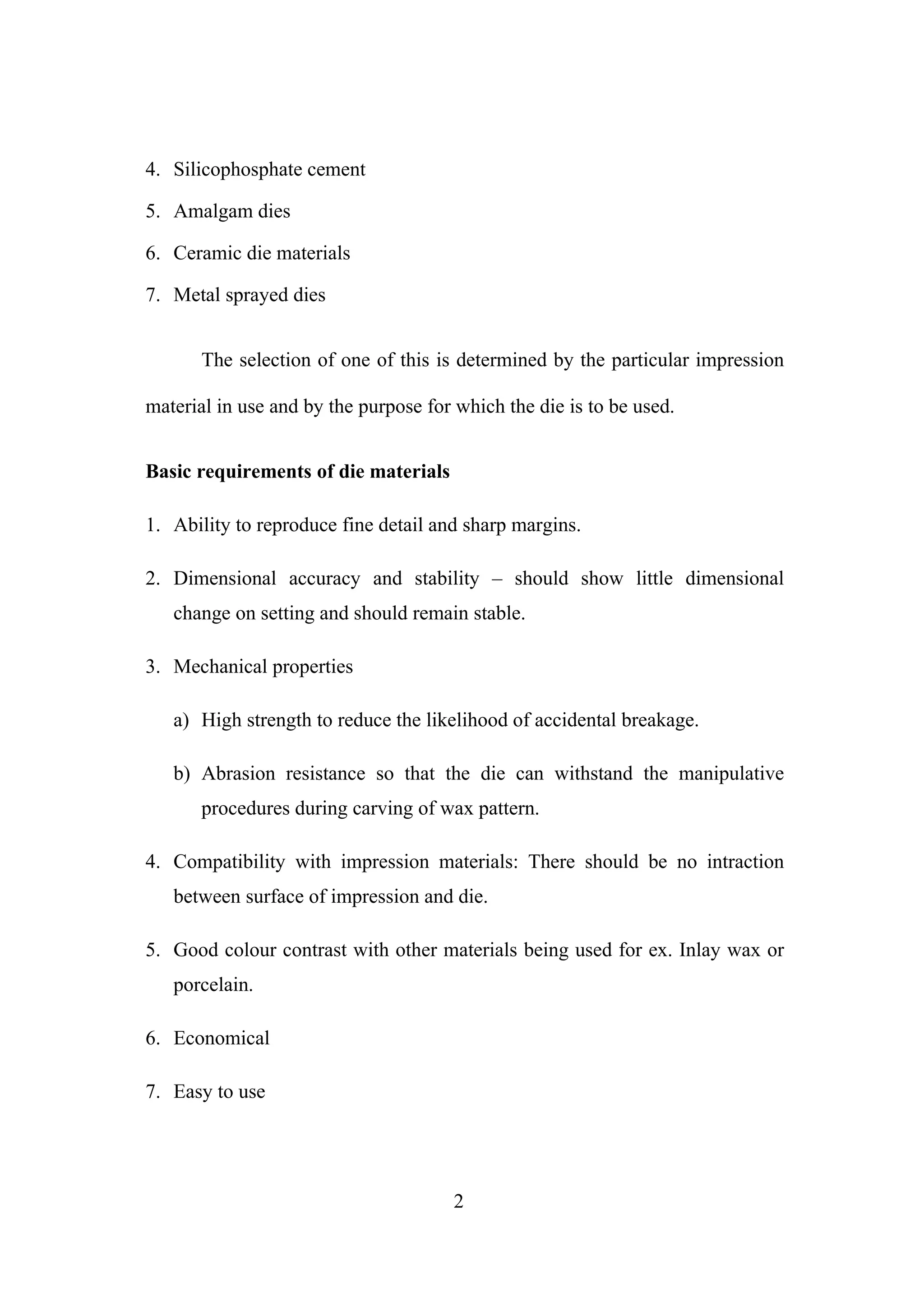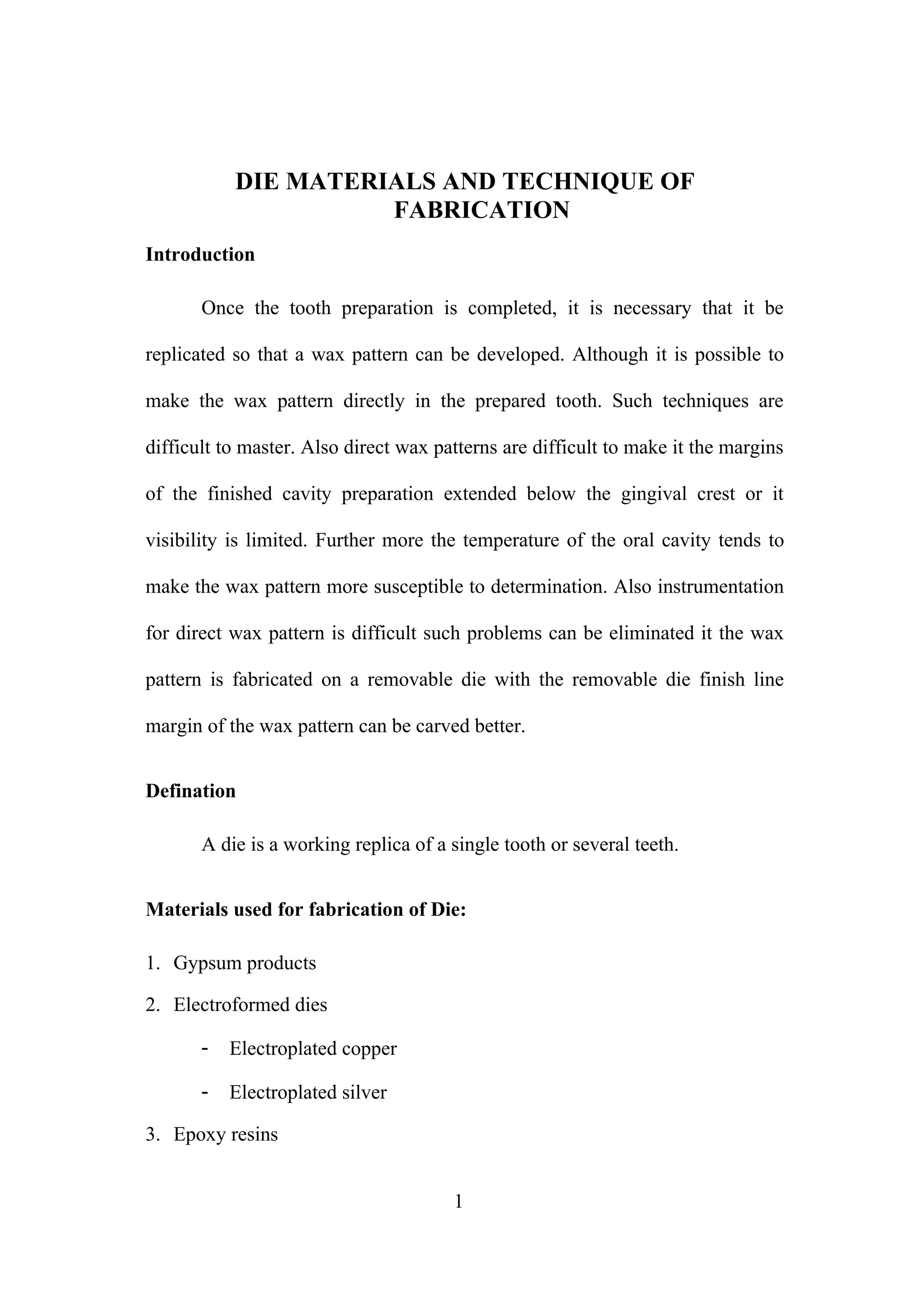 The document discusses the materials and techniques involved in fabricating dental dies, emphasizing the importance of creating a wax pattern after tooth preparation. Various materials, including gypsum products, electroformed dies, amalgam, and epoxy resins, are evaluated for their properties, advantages, and limitations in die fabrication. Additionally, it outlines essential requirements for die materials, such as dimensional accuracy, strength, and compatibility with impression materials.