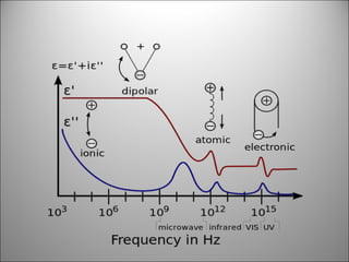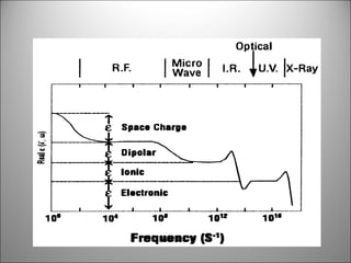Dielectrics are materials that have permanent electric dipole moments. All dielectrics are electrical insulators and are mainly used to store electrical energy by utilizing bound electric charges and dipoles within their molecular structure. Important properties of dielectrics include their electric intensity or field strength, electric flux density, dielectric parameters such as dielectric constant and electric dipole moment, and polarization processes including electronic, ionic, and orientation polarization. Dielectrics are characterized by their complex permittivity, which relates to their ability to transmit electric fields and is dependent on factors like frequency, temperature, and humidity that can influence dielectric losses.