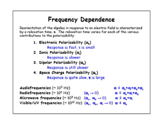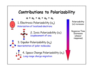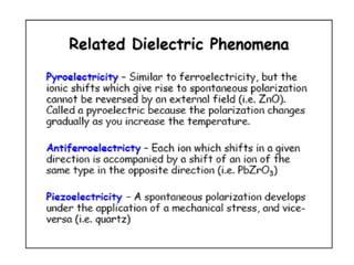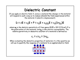 This document discusses dielectrics and their properties. It introduces dielectrics as materials that can store electric charge and energy with minimal heat loss. The document discusses how a capacitor's capacitance depends on the dielectric material between its plates, including the dielectric constant which measures a material's ability to concentrate electrostatic lines of flux. It also examines polarization in insulators when an electric field is applied and defines related terms like permittivity, dielectric constant, and loss tangent.