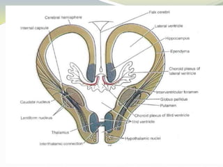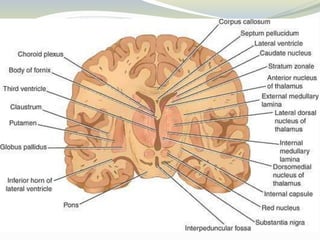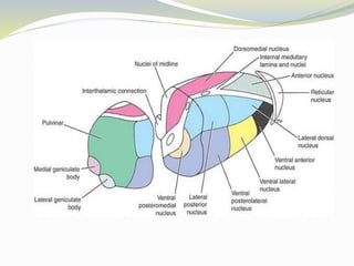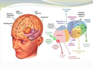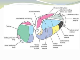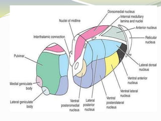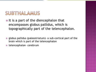 The document discusses the diencephalon region of the forebrain, focusing on the thalamus and hypothalamus. It describes the thalamus as the major part of the diencephalon, located on each side of the third ventricle. The thalamus is divided into anterior, medial, and lateral parts containing different thalamic nuclei. The hypothalamus lies ventral to the thalamus and is divided into preoptic, supraoptic, tuberal, and mamillary regions containing important nuclei that regulate functions like autonomic control, endocrine control, temperature, hunger and thirst, emotions, and circadian rhythms.