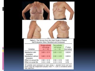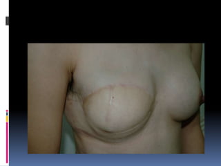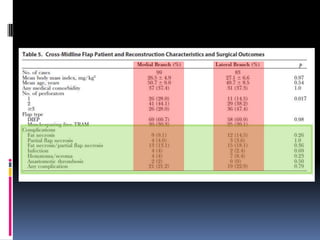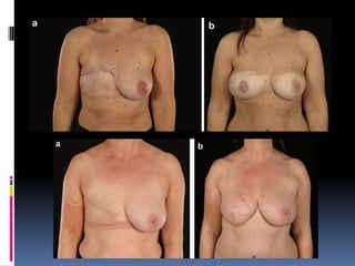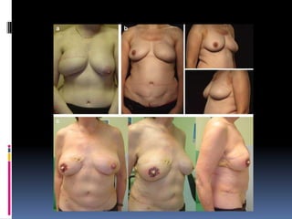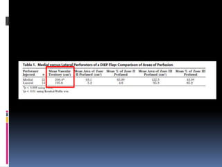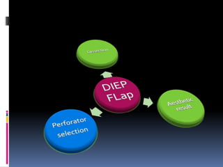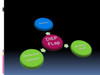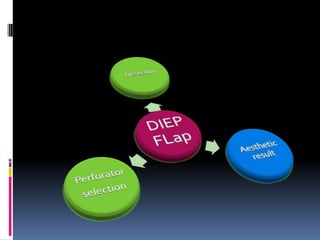This document discusses breast reconstruction using DIEP flaps, which involves using blood vessels and tissue from the lower abdomen. The goals of breast reconstruction are to provide a natural breast contour and shape, avoid the need for external prosthetics, and help patients regain confidence. The document discusses the history of breast reconstruction and why abdominal tissue became popular. It provides details on different types of flaps and considerations for medial versus lateral perforator flaps. Key points discussed are the importance of vessel diameter, central positioning of perforators, and vascular branching patterns. The document also addresses techniques like subfascial dissection and skin-sparing approaches to breast reconstruction.